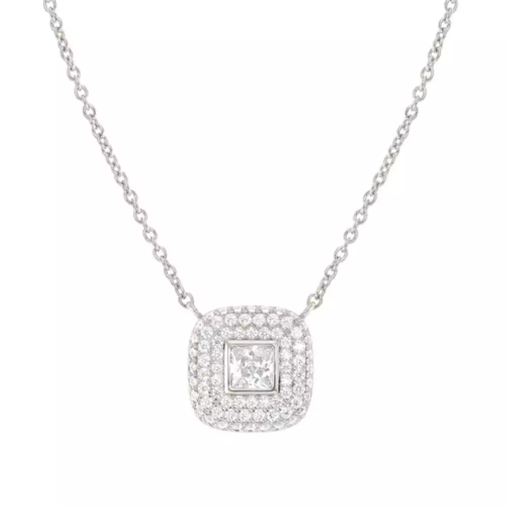 La collana della collezione Domina, è in argento 925, il pendente di forma quadrata ha un pavè di zirconi bianchi. Dallo stile classico e sobrio