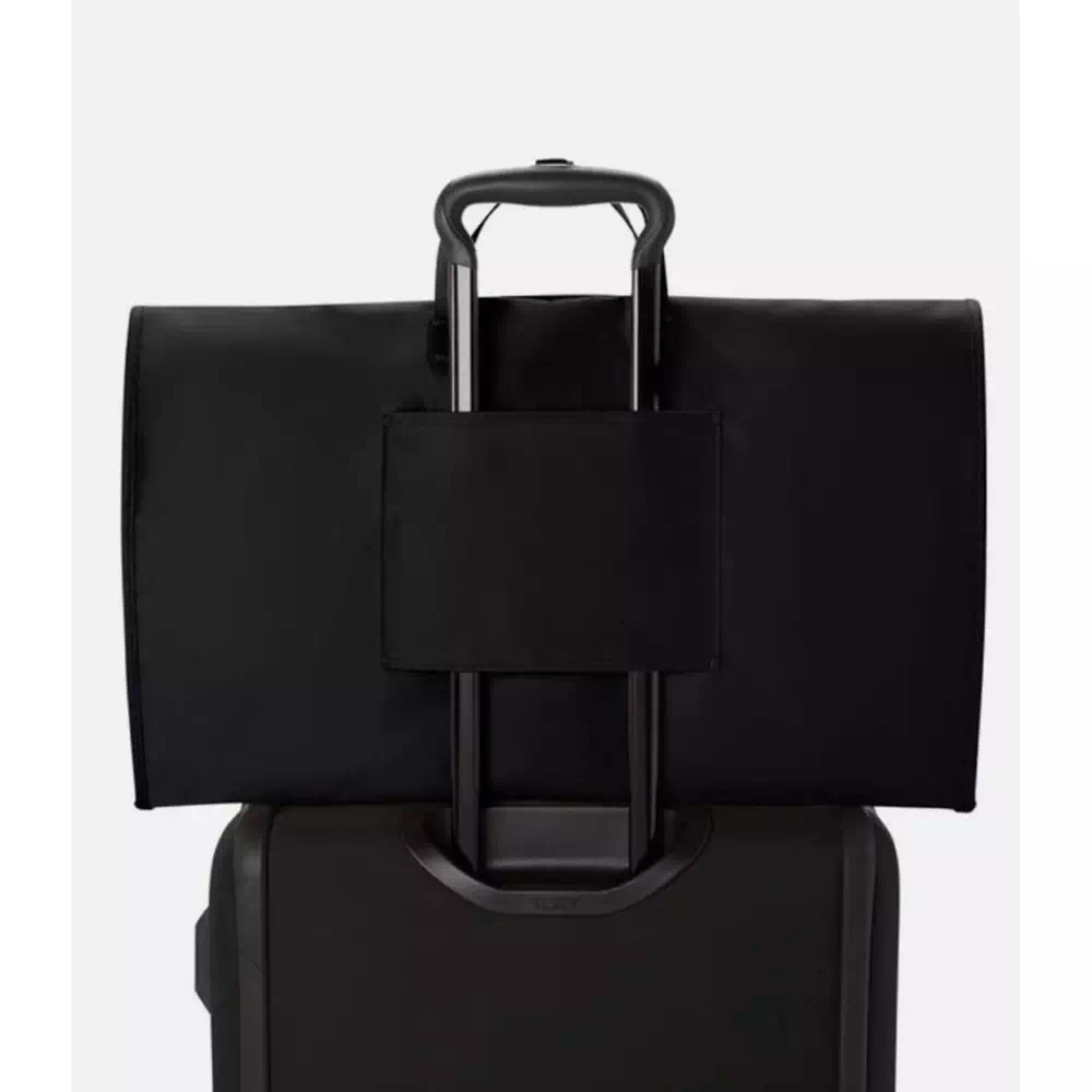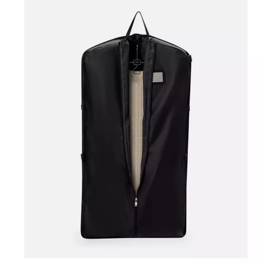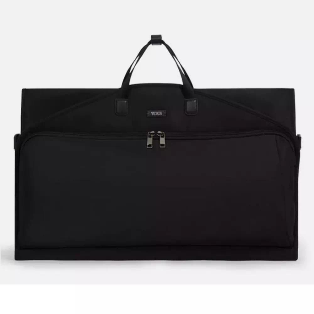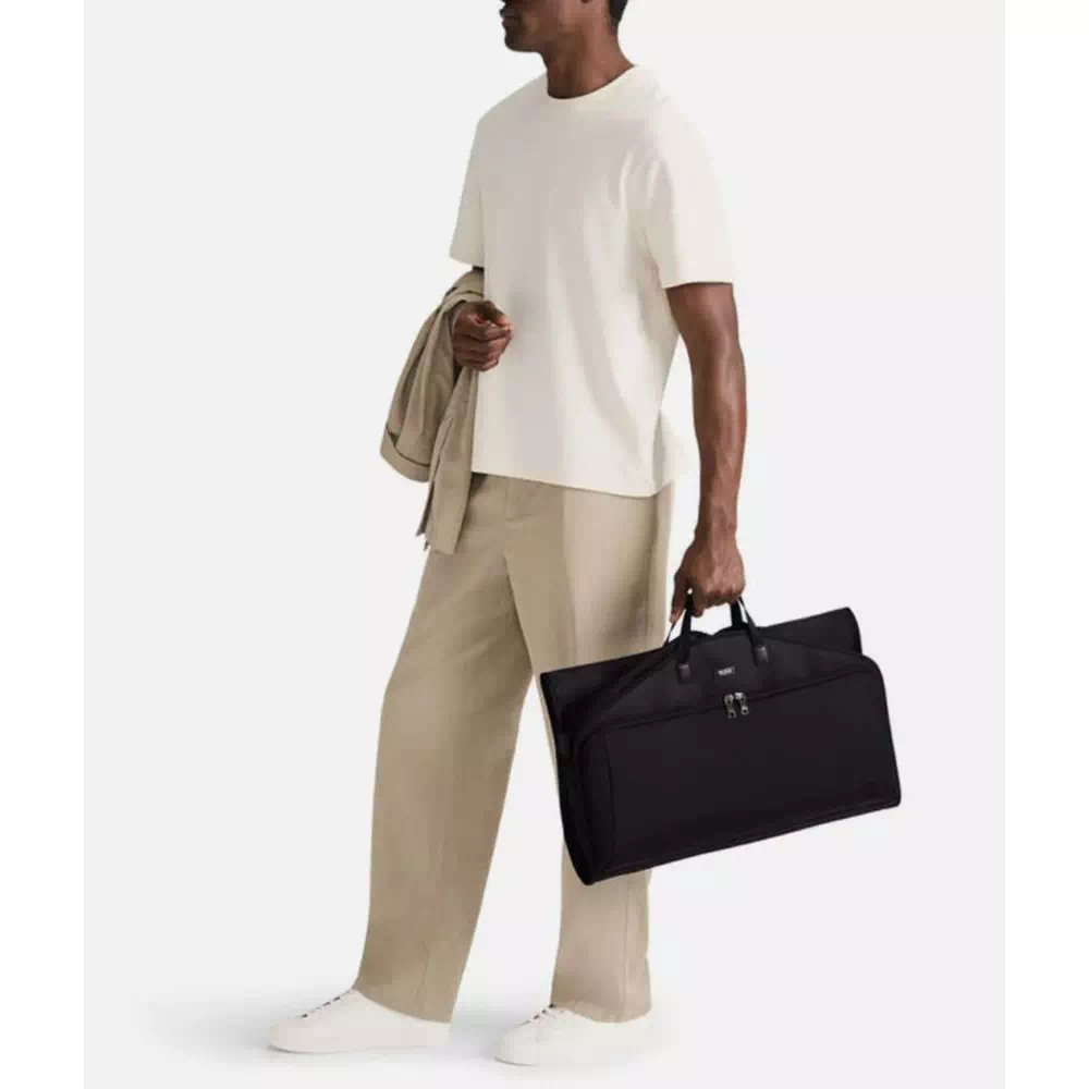 Prodotto in nylon. Esternamente ha una tasca con zip a U, Manici superiori in tessuto con avvolgimento in pelle, Clip di rilascio rapido sui lati per garantire la chiusura quando è piegata, Manica aggiungi-borsa. Internamente ha: apertura centrale con zip (contiene 2 abiti o vestiti) Asola in pelle per appendini, Tasca per finestra d’identificazione
