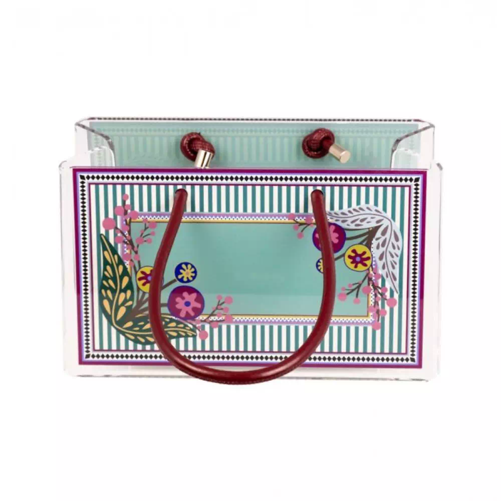 La shopper porta oggetti Bucarest è un elegante e pratico contenitore multiuso dal design originale, ispirato alla forma di una borsa. Realizzata in resistente cristallo acrilico, si distingue per la sua estetica raffinata e per le grafiche stampate nel fronte, proprio come una borsa. I manici in ecopelle, coordinati in base alla grafica scelta, aggiungono un tocco di eleganza e praticità, rendendolo non solo un complemento d’arredo decorativo, ma anche funzionale e facile da spostare.