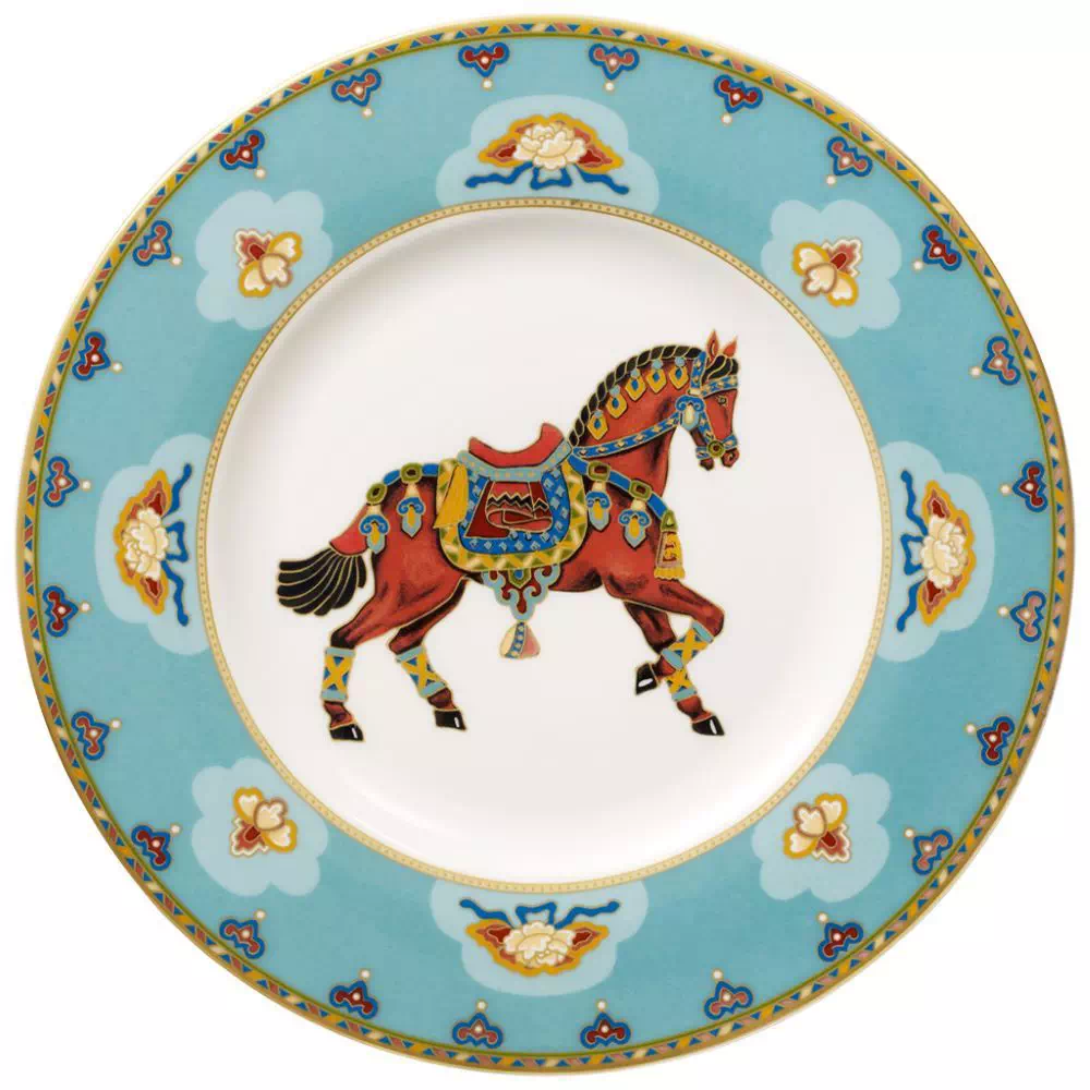 La collezione Samarkand di Villeroy & Boch combina motivi di cavalli, cammelli ed elefanti con colori vivaci come il blu acquamarina, il rosso rubino e un elegante arancio mandarino. Lo stile orientale della collezione vi porta in un viaggio lungo la Via della Seta attraverso la Cina, l’Asia Centrale e la Persia. Già dal 1748 Villeroy & Boch è sinonimo di raffinato design della porcellana Questo accattivante piatto da colazione fa parte della collezione Samarkand Aquamarin.